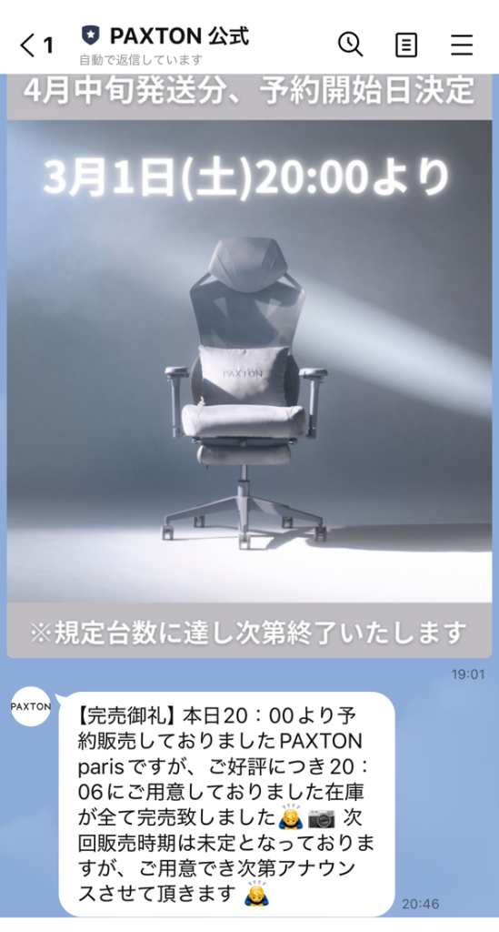 直近の公式LINEをみても、20:00発売で20:06に完売となっています。